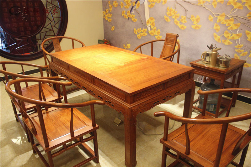 茶桌的客人地位选取的是经典格局的圈椅,周围都有包裹,做起来很舒服哟。